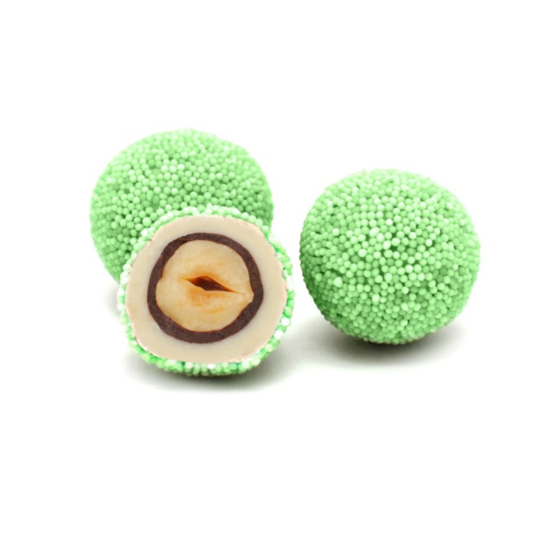 “Nocciole Piemonte IGP” ricoperte da un doppio strato di cioccolato bianco e fondente (cacao min. 78,9%). Il tutto viene completamente avvolto da centinaia di micro confettini verdi di zucchero cristallizzato.