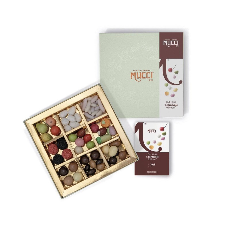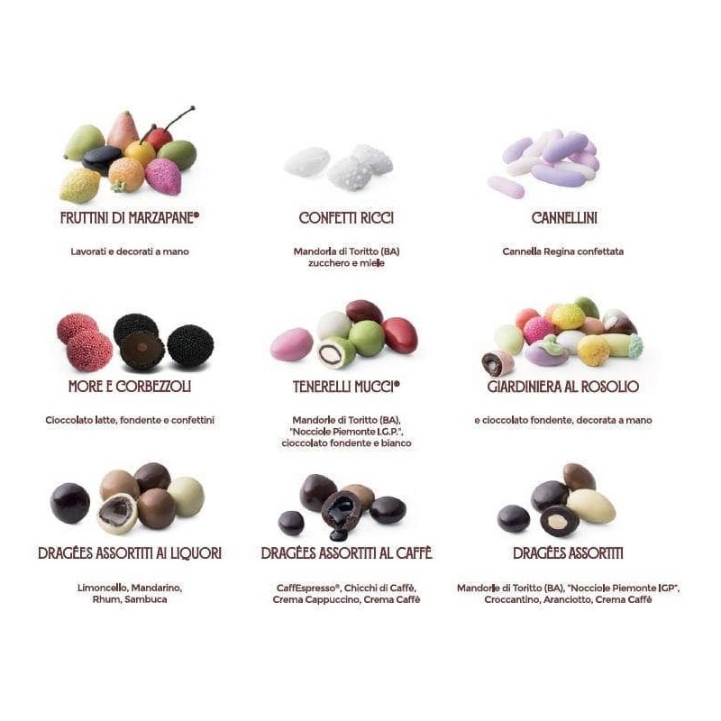 All'interno della confezione troverai: Fruttini di Marzapane®, Confetti Ricci bianchi, Cannellini, More e Corbezzoli al cioccolato, Tenerelli Mucci®, Giardiniera al Rosolio, Dragées assortiti ai Liquori, Dragées assortiti al Caffè, Dragées assortiti al Cioccolato.