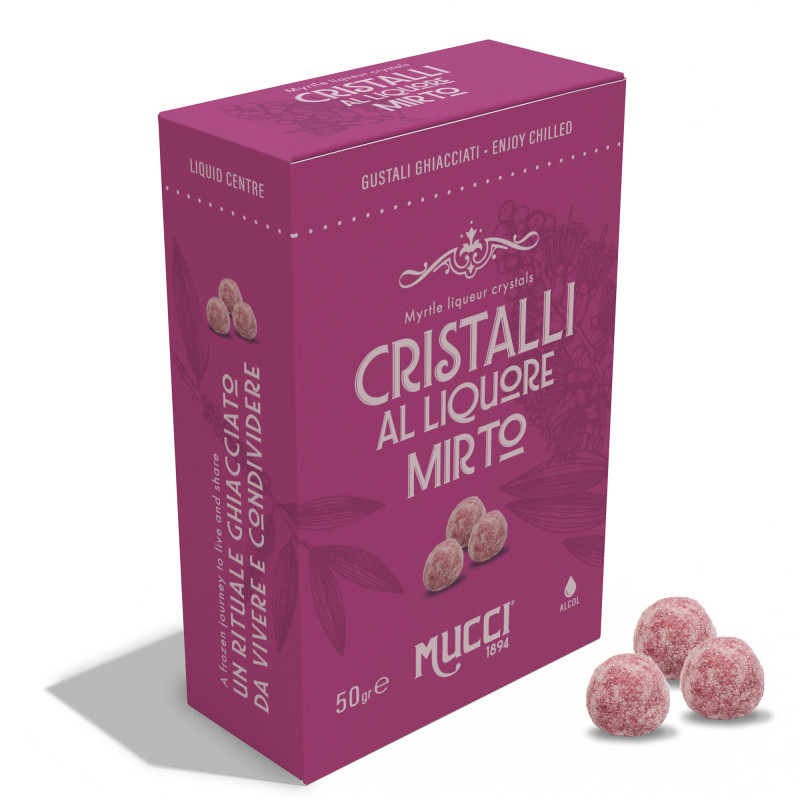 Liquore al Mirto custodito da un sottilissimo rivestimento di zucchero cristallizzato. Questi piccoli cristalli dalla eccellente gradazione alcolica, racchiudono tutto il sapore di questa pianta aromatica, tipica della Sardegna e della Corsica. Ideali da gustare ghiacciati.