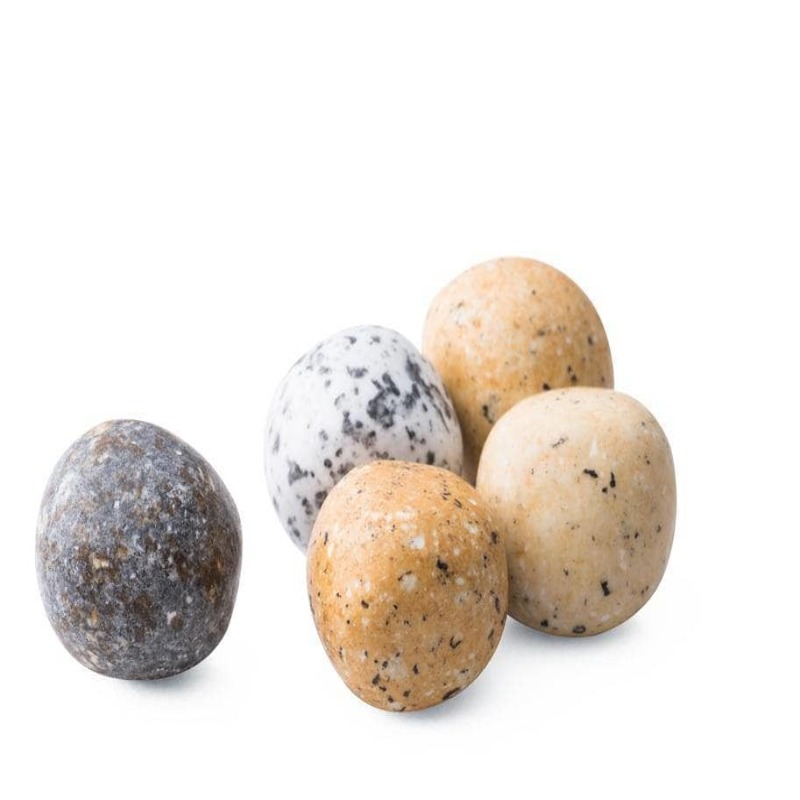 Delizioso e morbido marzapane realizzato con mandorle pugliesi di Toritto “Filippo Cea”, ricoperto di cioccolato e finemente confettato. Questi confetti sono marmorizzati con i colori della ghiaia.