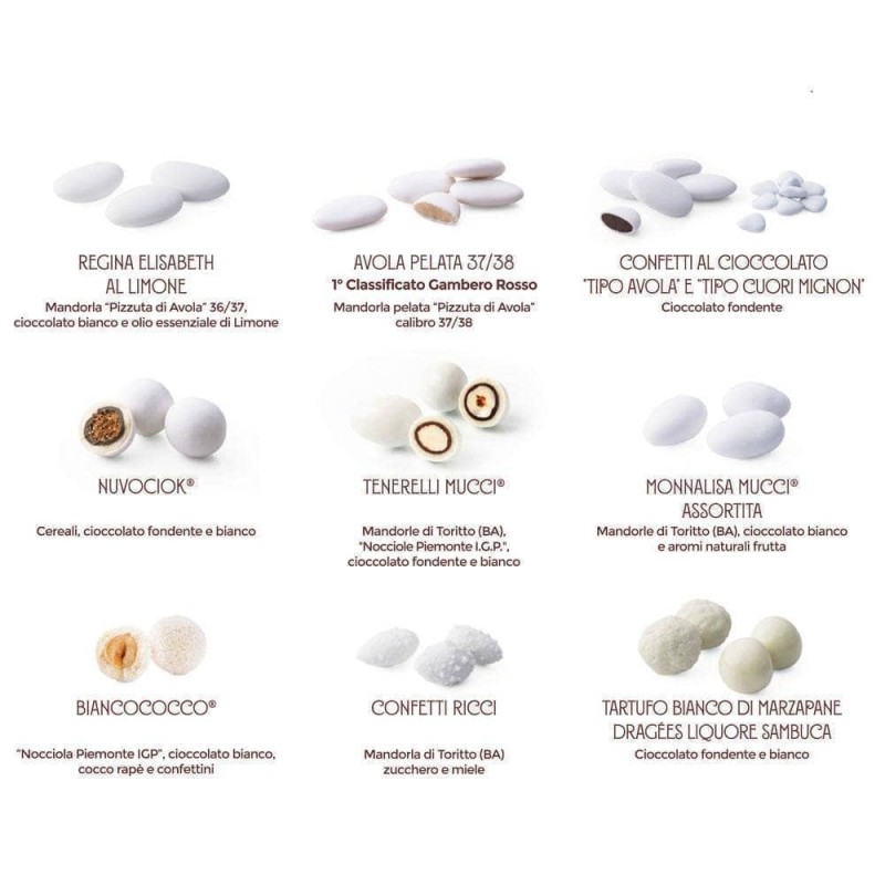 All'interno della confezione troverai: Regina Elisabeth al Limone bianca, Avola Pelata 37/38 premiata Gambero Rosso, Confetti al Cioccolato "Tipo Avola" bianca e "Tipo Cuori Mignon" bianchi, Nuvociok® Cereali confettati, Tenerelli Mucci® bianchi, Monnalisa Mucci® assortita bianca, Biancococco®, Confetti Ricci bianchi, Tartufo Bianco di Marzapane, Dragées Liquore Sambuca.