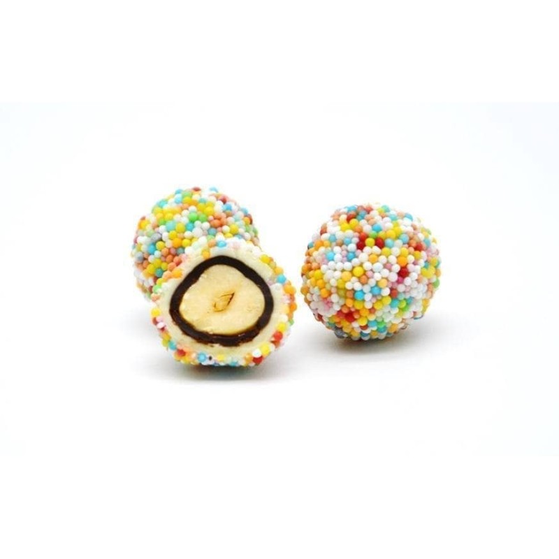 “Piedmont Hazelnuts I.G.P.” coated in a white and dark chocolate double layer (cocoa 78,9% min.). On the surface, coloured sprinkles give a touch of contagious and inviting cheerfulness.