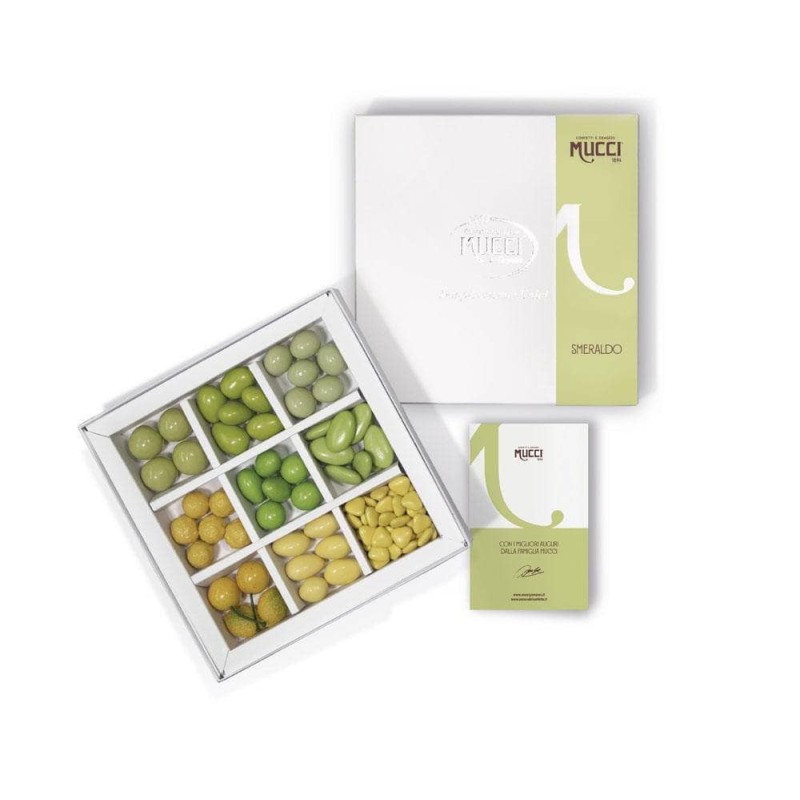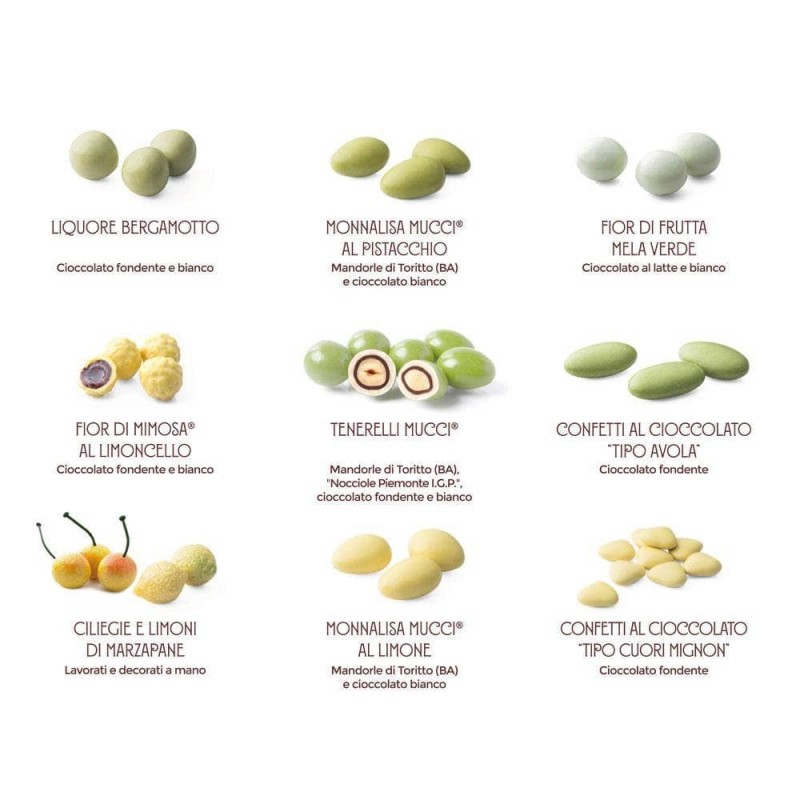 All'interno della confezione troverai: Dragรฉes al Liquore Bergamotto, Monnalisa Mucciยฎ al Pistacchio colorata, Fior di Frutta Mela Verde, Fior di Mimosaยฎ al Limoncello,ย Tenerelli Mucciยฎ verdi,ย ย Confetti al Cioccolato "Tipo Avola" verdi, Ciliegieย e Limoni di Marzapane,ย Monnalisa Mucciยฎ al Limone colorata,ย Confetti al Cioccolato "Tipo Cuori Mignon" gialli.