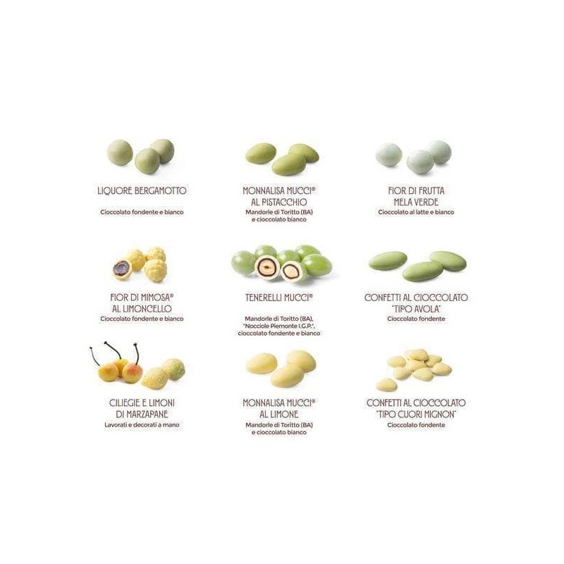 All'interno della confezione troverai: Dragรฉes al Liquore Bergamotto, Monnalisa Mucciยฎ al Pistacchio colorata, Fior di Frutta Mela Verde, Fior di Mimosaยฎ al Limoncello,ย Tenerelli Mucciยฎ verdi,ย ย Confetti al Cioccolato "Tipo Avola" verdi, Ciliegieย e Limoni di Marzapane,ย Monnalisa Mucciยฎ al Limone colorata,ย Confetti al Cioccolato "Tipo Cuori Mignon" gialli.