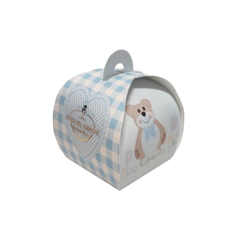 Tortina in cartoncino contenente 5 confetti celesti e bianchi, confezionati singolarmente, in gusti assortiti: Tenerelli Mucci® Celesti con Mandorla di Toritto(Ba) e Nocciola Piemonte Igp ricoperte di cioccolato bianco, fondente e confettate; Regina Elisabeth Celeste con Mandorla Pizzuta di Avola ricoperta di cioccolato bianco e olio essenziale di Limone; Monnalisa Mucci® Bianca con Mandorla di Toritto(Ba) ricoperta di cioccolato e aromi naturali di frutta; Cri Cri celesti con Nocciola Piemonte Igp e cioccolato; BiancoCocco® con Nocciola Piemonte Igp, cioccolato bianco e cocco.
